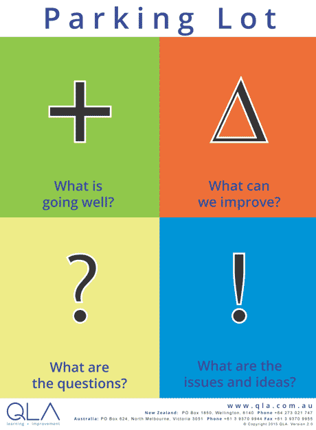 - Parking lot. Introducing the parking lot in class. The parking lot is a chart that helps the teacher determine what is on the students’ minds. It includes sections on what is working well; what needs to be changed; what questions the students have; and what have they learned. See the example below. The students need post-it notes to be able to use this. A Parking Lot should be posted in the room at all times; students can place post-its on the chart anonymously at any time; teachers can ask students to post as they leave the class or trying a new structure. Best advice is to place the Parking Lot near the door so students can place a comment or read the comments at the end of class.