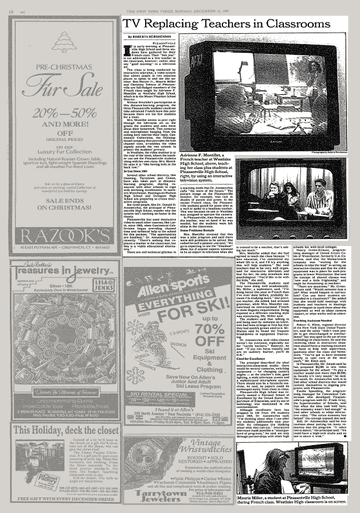 This class is being conducted by interactive television, a video system that allows people in two separate places to speak to and see one another. Ben Matteo Jr., Mauria Miller and Christina Telesco of Pleasantville are full-fledged members of the French class taught by Adrienne F. Montillet at Westlake High School, which is in the Mount Pleasant School District. Source: New York Times 1991