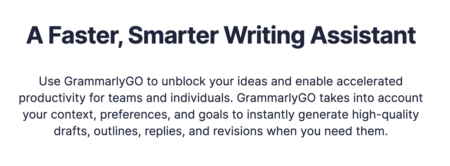 Jumpstart your writing like never before with generative AI assistance. Instantly compose, rewrite, ideate, and reply using GrammarlyGO as your personalized, context-aware co-creator. GrammarlyGO brings the power of fourteen years of best-in-class communication AI—trusted by tens of millions.
